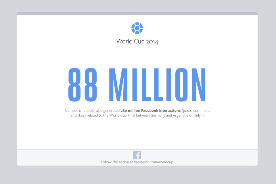 Brezilya’da düzenlenen 2014 Dünya Kupası sosyal medyada son 1 aylık dönemin en çok konuşulan olayı olurken, final maçıyla birlikte bu etkileşim zirveye ulaştı. Facebook veri ekibinin yaptığı ölçümlere göre, dün akşam Almanya ve Arjantin arasında oynanan final müsabakası, Facebook tarihinde en fazla etkileşimin kaydedildiği spor etkinliği oldu.