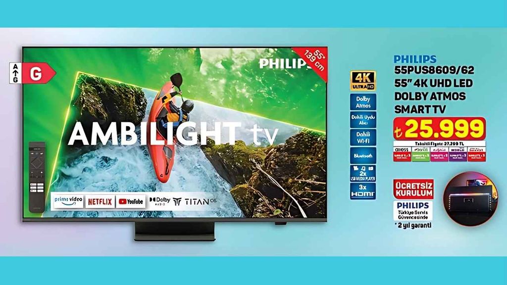 29 Mayıs 2025 Perşembe günü A101’de satışa çıkacak olan Philips 55PUS8609/62 modeli, 25.999 TL fiyat etiketiyle raflardaki yerini alacak. Taksitli ödeme seçeneğiyle 27.200 TL’ye kadar çıkan bu model, sınırlı stokla tüketicinin karşısına çıkmaya hazırlanıyor. Ne var ki bu modelin sunduğu bazı özellikler, onu fiyatının yanında donanımıyla da konuşulur hâle getiriyor.