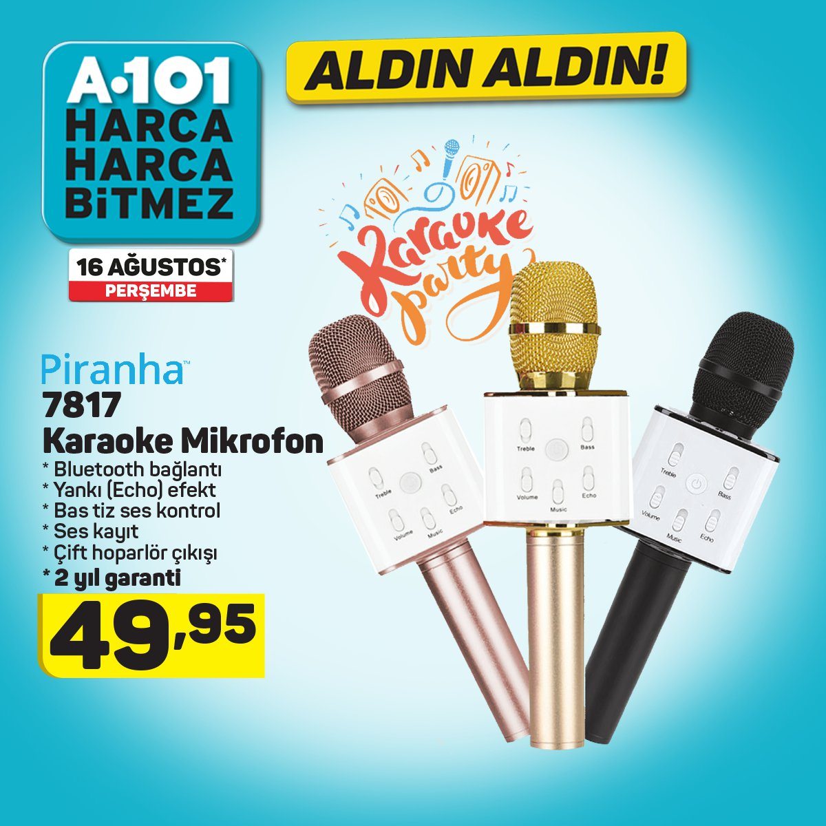 A101’de bu hafta Piranha’nın birbirinden eğlenceli aksesuarları satışa sunuluyor. Piranha Karaoke Mikrofon ile müziğin ve şarkı söylemenin tadını çıkarın. Bluetooth özelliği ile kablosuz kullanılan mikrofon, yankı efekti, bas/tiz kontrol, ses kayıt ve çift hoparlör çıkışına sahip. İki yıl garantili ürün, 49.95 TL’den satışa sunuluyor.
