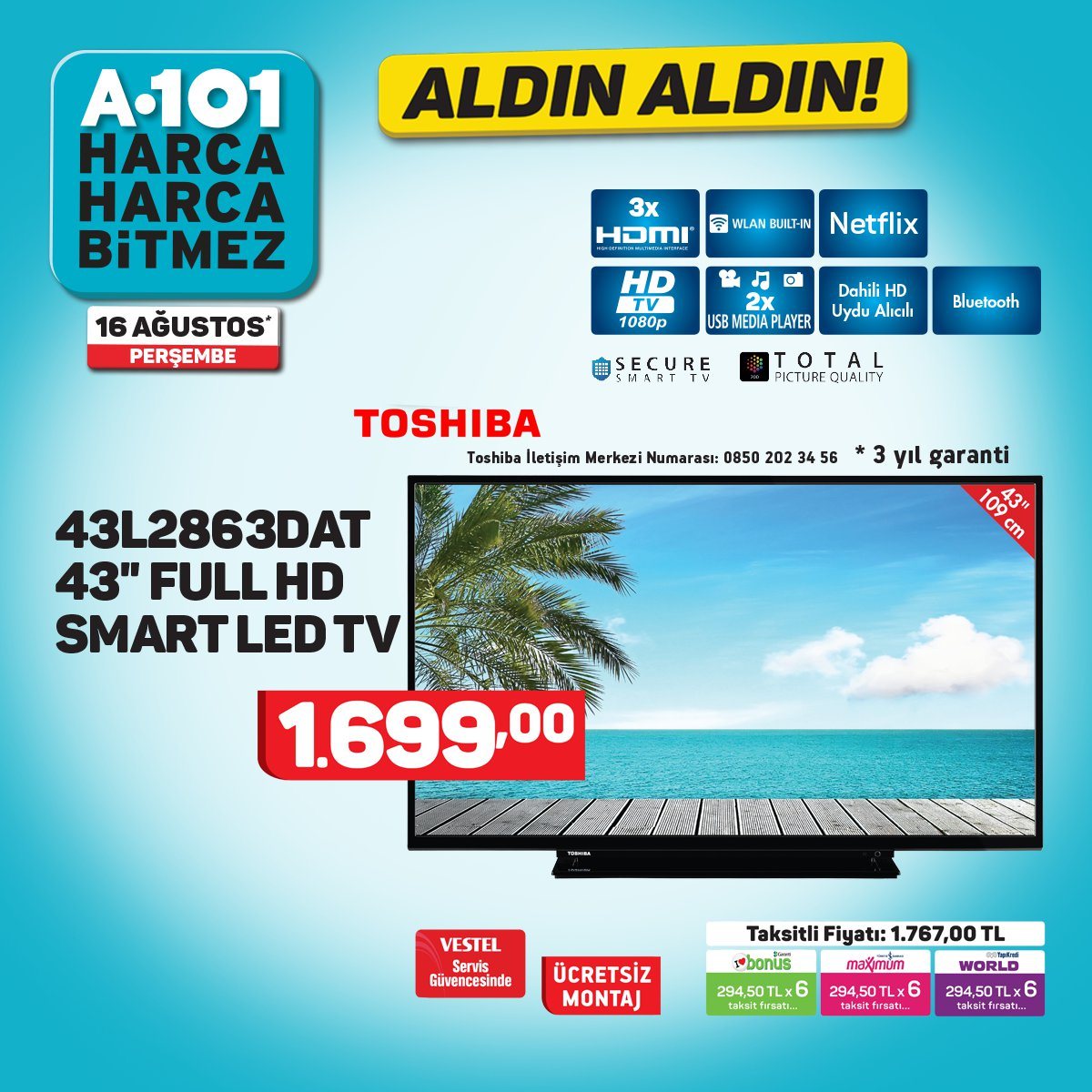 Bu haftanın televizyonu Toshiba 43″ Smart LED TV, dahili uydu alıcılı ve bluetooth özellikli. HD kalitesinde görüntü ve akıllı televizyon özellikleri ile Netflix dahil sınırsız eğlence sunan ürünün, 3 HDMI ve 2 adet USB Media Player girişi bulunuyor. Ücretsiz montaj hizmeti ve Vestel Servis güvencesiyle 1699 TL’den satışa sunulan ürün, 3 yıl garantili ve 6 taksit seçeneğine sahip.