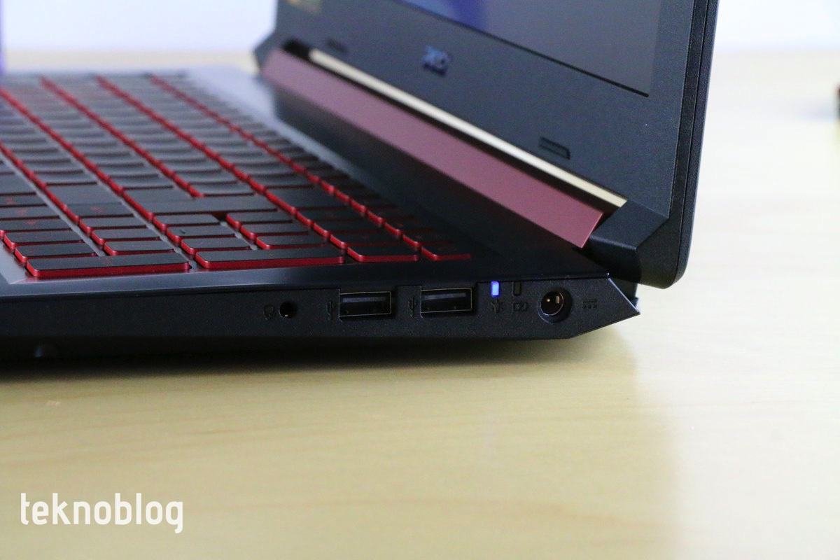 Acer Nitro 5, giriş sayısı bakımından oldukça zengin bir dizüstü bilgisayar. Kasanın sağ kenarında 3.5 mm. kulaklık/mikrofon jakı, iki adet USB 2.0 girişi ve güç girişi bulunuyor. Buna ek olarak, şarj ve güç durumunu gösteren iki LED gösterge de sağ kenarın üyeleri arasında yer alıyor.