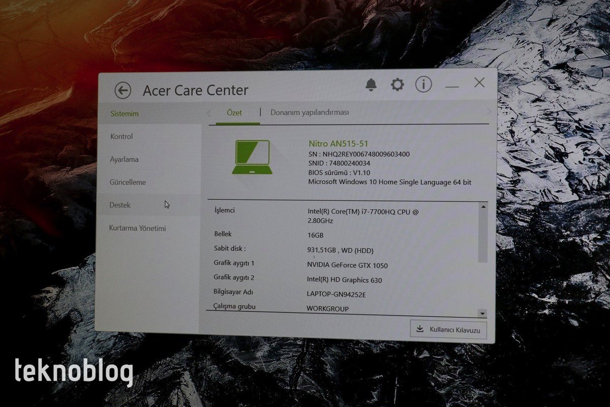 Söz konusu uygulamalar, Windows 10’un Başlat çubuğunda Acer klasörü altında yer alıyor. Bu uygulamalardan biri olan Acer Care Center, bir tür yönetim paneli işlevi görüyor. Kullanıcılar bu uygulama üzerinden cihazlarının teknik özelliklerini ve donanım yapılandırmasını görebiliyor, dahili depolama alanını ve pil sağlığını kontrol edebiliyor.
