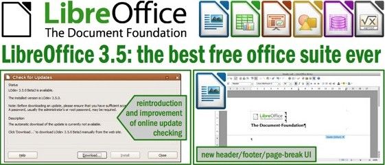 LibreOffice 3.5 versiyonunda aralarında dahili gramer denetçisi, gerçek zamanlı kelime sayaç penceresi gibi çeşitli kelime işlemci güncellemeleri kazanıyor. PowerPoint muadili yazılımı Impress ise multimedya içeriklerini sunuma iliştirme, özelleştirilmiş renk paletleri gibi güncellemeler barındırıyor. Calc adı verilen Excel muadili ise çalışma defteri başına 10 bin sayfa desteği sunuyor.