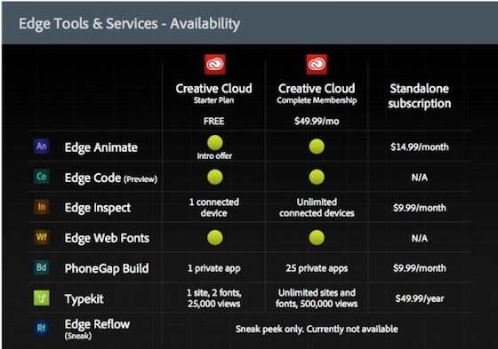 Edge Animate geçen yıl tanıtılmıştı, bu yılla birlikte artık beta sürecinden çıkıyor. Bu paket 499 dolarlık peşin veya 14.99 dolarlık aylık ödemelerle satılacak olsa da, şu an için geçici olarak ücretsiz sunuluyor. Bu servis abonelik bazlı Creative Cloud’ın içinde, diğer Edge ürünleriyle birlikte sunuluyor. Edge Animate ürününe altı farklı ürün eşlik ediyor. Bunlar arasında bulunan Edge Reflow PC’ler, tabletler ve telefonlar için site grafiklerinin çevrilmesine olanak sağlayan web tabanlı bir araç. Bileşenlerden birkaçı ise yazı tipi kütüphanesi Typekit gibi mevcut uygulamalar veya yeniden adlandırılmış ürünlerden oluşuyor. Örneğin mevcut Brackets kod editörünün adı Edge Code olarak değişitirilmiş, Edge Inspect adlı HTML ön izleme aracı da “Shadow” kod adıyla yeniden geliştirilmiş. Google yardımıyla oluşturulan ücretsiz çevrim içi yazı tipi veri tabanı Edge Web Fonts ve mobil uygulamaların paketlenmesine olanak sağlayan PhoneGap Build de Adobe Edge paketinin içinde yer alıyor. Reflow haricinde diğer ürünler satın alma veya ön izlemeye açılmış durumda.