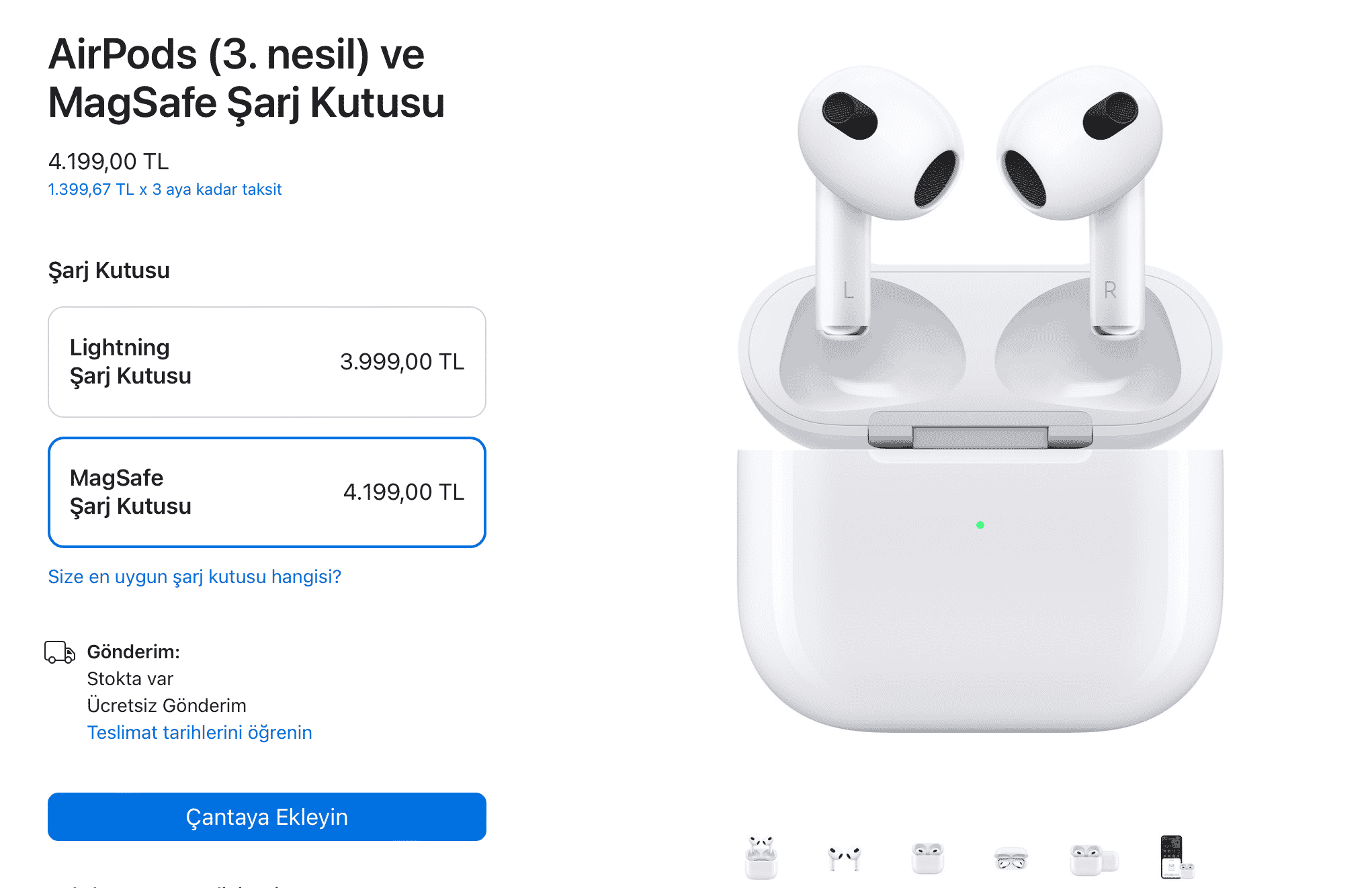 Pro olmayan bu üçüncü nesil AirPods kulaklıkları MagSafe Şarj Kutusu yerine Lightning Şarj Kutusu ile de satın almanız mümkün oluyor. Yani şarj kutusunda kablosuz şarj özelliği bulunmayan versiyonu da tercih edebilirsiniz. AirPods 3. Nesil için Lightning Şarj Kutusu 3.999 TL’ye satılırken MagSafe Şarj Kutusu barındıran versiyon için 4.199 TL isteniyor.
