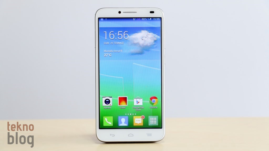Telefonun ön yüzünde 5 inç ekran büyük bir alan kaplıyor. Ekranın dışında kalan çerçeve dar tutulmuş, böylelikle telefonun yüzey alanı mümkün olabildiği kadar kısıtlanmış. 7.3 mm. kalınlıklı gövdeyle birlikte değerlendirildiğinde Alcatel OneTouch Idol 2 ergonomisi yüksek, kullanımı rahat bir telefon niteliğinde. Telefonun sağ kenarında ses ve güç tuşları bulunurken sol kenarda da microSD ve microSIM kart yuvaları bulunuyor. Üstte 3.5 mm. kulaklık jakı ve mikrofon, altta da hoparlör, mikrofon ve microUSB portu bulunuyor. OneTouch Idol 2’nin mikrofonu yüksek ses veriyor ve orta frekanslar epey kuvvetli. Ancak ses fazla açıldığında çok yüksek derecede patlama hissediyorsunuz.