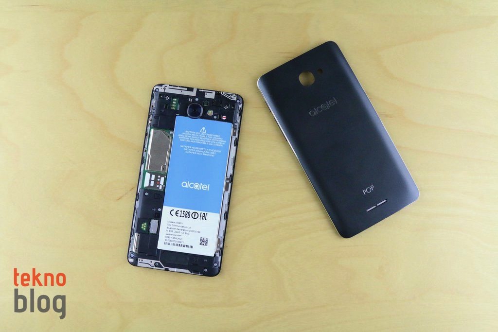 Alcatel Pop 4S’in plastik arka kapağı yerinden çıkarılabiliyor. Alcatel kullanıcılara farklı renklerde arka kapaklar sunarak kişiselleştirme imkanı sağlasa da, bu kapaklar en azından şu an için Türkiye’de satılmıyor. Arka kapağın üst kısmında 13 megapiksel kamera bulunuyor. Çift renkli LED flaş da hemen kameranın yanına yerleştirilmiş. Kamera ve flaşın biraz altında Alcatel logosu yer alıyor. Arka panelde iyice aşağıya inildiğinde ise kullanıcıların karşısına hoparlör çıkıyor. Hoparlörden çıkan sesin yüksekliğinin ve kalitesinin makul seviyede olduğu söylenebilir. Arka kapak açıldığında kullanıcıları yerinden çıkarılamayan 2960 mAh kapasiteli pil ile microSIM ve microSD kart yuvaları karşılıyor.