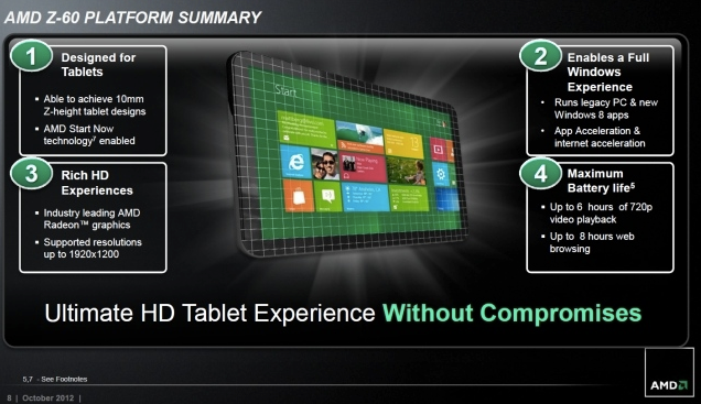 AMD Z-60 bu yılın sonlarına doğru tabletlere gelmiş olacak. Bu işlemci sayesinde Windows 8 yüklü hibrit bilgisayarlar tablet modunda 10 saatin üzerinde pilde çalışma süresi elde edebilecek. Tablet bir yerleştirme istasyonuna konduğunda ise normal bir PC gibi performans gösterecek, üzerinde normale göre fazla performans gereksinimi duyan oyunları bile oynatabilecek. AMD Radeon HD grafik desteği barındıran ve 1920 x 1200’e kadar çözünürlük desteği sunan bu yongaset 720p çözünürlükte 6 saate kadar video oynatma yeteneğini de kazandıracak. Z-60 tabanlı sistemler yeni Windows 8 uygulamalarını çalıştırmanın yanı sıra eski yazılımları da çalıştırabilecek.