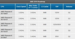 Turbo Core’un Intel’inkine göre daha az karmaşık bir otomatik hız aşırtma teknolojisi var. Altı çekirdeğin üçü yavaşlatılarak diğer üçlüye ek gerilim ve hız sağlanarak daha sıralı iş yükü sağlanabiliyor. Gerçekten etkileyici olan şey ise Turbo Core modu altında ve varsayılan altı çekirdek düzeninde mevcut Phenom II X4 işlemcilerle aynı seviyede güç tüketimi yakalanabiliyor. Bu arada AMD sadık kullanıcılarına yeni Phenom II X6’ların mevcut AM3 ve AM2+ soketleriyle de uyumlu olacağının garantisini veriyor. Yazının devamında daha büyük boyutunu bulacağınız tablo AnandTech tarafından sağlandı, buradan modellerle ilgili daha fazla ayrıntıyı bulmanız mümkün.
