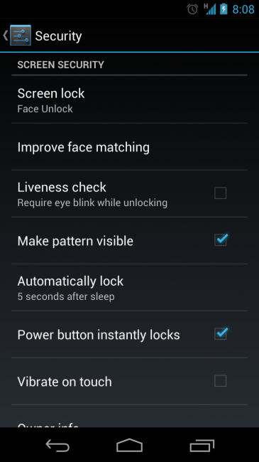 Yüz Kilidi Android 4.0 ile birlikte sunulan en dikkat çekici özellikler arasında yer alıyordu. Bu güvenlik yöntemi cihazın sahibini öndeki kamera aracılığıyla tanıması ve ekran kilidini kaldırmasını ileri getiriyor. Ne var ki, bu yöntemin güvenli yöntemlerden biri olduğunu söylemek zor. Çünkü telefonun kamerasına telefon sahibinin bir fotoğrafını gösterip kandırmak mümkün.