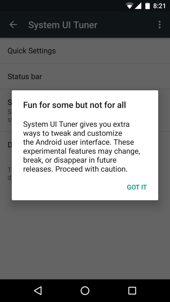 Önceki Android M ön izleme sürümlerinde Google kullanıcılara Sistem Kullanıcı Arayüzü Düzenleyicisi şeklinde bir arayüz sunarak güzellik yapmıştı. Bu son ön izleme sürümüne yükseltme yapan veya onu sıfırdan yükleyenler bu seçeneği görmeyince paniğe kapılmasınlar. Google bunu kaldırmış değil, ancak bulmayı ve tekrar etkinleştirmeyi biraz daha zor hâle getirmiş.