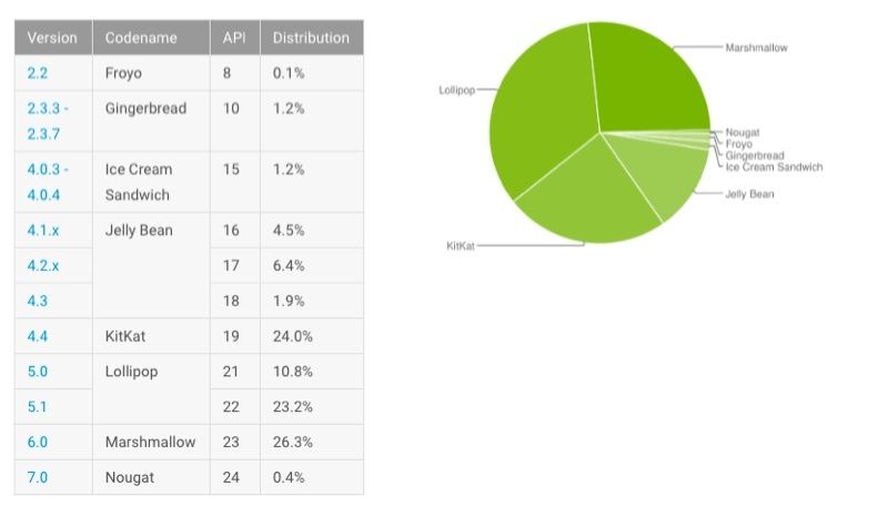 Aralık ayı rakamlarına göre, Android cihazlarının yüzde 34’ü Android Lollipop sürümleriyle çalışıyor. Bu rakamda da bir ay öncesine kıyasla yüzde 0.1’lik bir düşüş kaydedildi. Android 5.0’ın benimseme oranı yüzde 10.8, 5.1’in benimseme oranı yüzde 23.2 oldu. En popüler Android sürümleri sırasında ikinci sırada ise Android 6.0 Marshmallow bulunuyor. Android cihazlarının yüzde 26.3’ü Android Marshmallow ile çalışıyor. Android KitKat sürümleri yüzde 24, Jelly Bean sürümleri yüzde 12.8, Ice Cream Sandwich ve Gingerbread sürümleri de yüzde 1.2 benimseme oranıyla listede yer alıyor. Yıllanmış Android sürümlerinden biri olan Froyo da yüzde 0.1 benimseme oranıyla varlığını sürdürüyor.