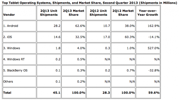 Yıllık düzlemde etkileyici bir biçimde büyüyen tablet pazarında Android işletim sistemli cihazların hızlı yükselişi dikkat çekiyor. Android tablet sevkiyatları bir önceki yıla göre yüzde 162.9 oranında artarak 10.7 milyondan 28.2 milyon birime ulaşırken, işletim sistemi bazında da Android’in liderliği iOS’ten devraldığı görülüyor. Android’in tablet pazarındaki payı 2013’ün ikinci çeyreğinde yüzde 62.6’yı bulurken, iOS yüzde 32.5’lik pazar payıyla ikinci sırada yer alıyor.