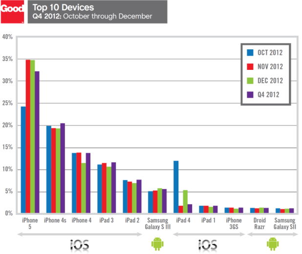 Sonuçları değerlendiren Good Technology Başkanı ve CEO’su Christy Wyatt, CIO’ların artık değişik mobil ürün gruplarını destekleyerek üretkenliği arttırabildiklerinin farkına vardıklarını belirtti. Wyatt kurumların çalışanlarına sundukları mobil uygulamaların erişilebilirliğini arttırmasını beklediklerini de sözlerine ekledi. Yüzde 32’lik aktivasyon oranıyla iPhone 5 2012’nin son çeyreğinde kurumsal kullanıcıların en çok talep gösterdikleri cihaz oldu. Android akıllı telefonlar arasında birinciliği yüzde 6 ile Galaxy S III aldı. Tablet pazarındaysa iPad yüzde 93.2’lik aktivasyon oranıyla büyük bir hakimiyet sağladı. Android tabletlerin toplam pazar payı yüzde 6.8’de kaldı.