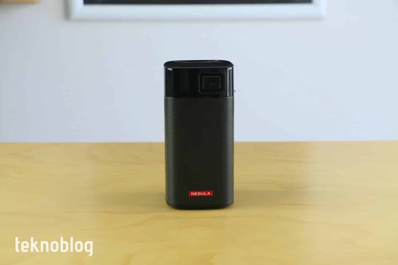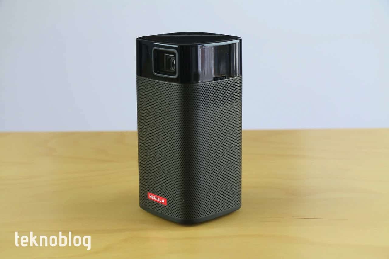 Nebula Apollo, dikdörtgen prizması biçiminde bir gövdeyle geliyor. Siyah tonların ağırlıkta olduğu bu gövdenin hafif kavisli köşeleri cihazı kavramayı kolaylaştırırken daha şık bir hava elde etmesine yardımcı oluyor. Ön tarafında, alta doğru yerleştirilmiş bir Nebula logosu var. Üst taraftaki beşte birlik dilim parlak bir kaplamaya sahip, geri kalan bölüm ise tamamen ızgara görünümlü mat bir dokuyla kaplanmış. Aslında bu iki tasarım tercihi, Nebula Apollo’nun bir projektör-hoparlör hibridi cihaz olduğunu daha açık biçimde gösteriyor.