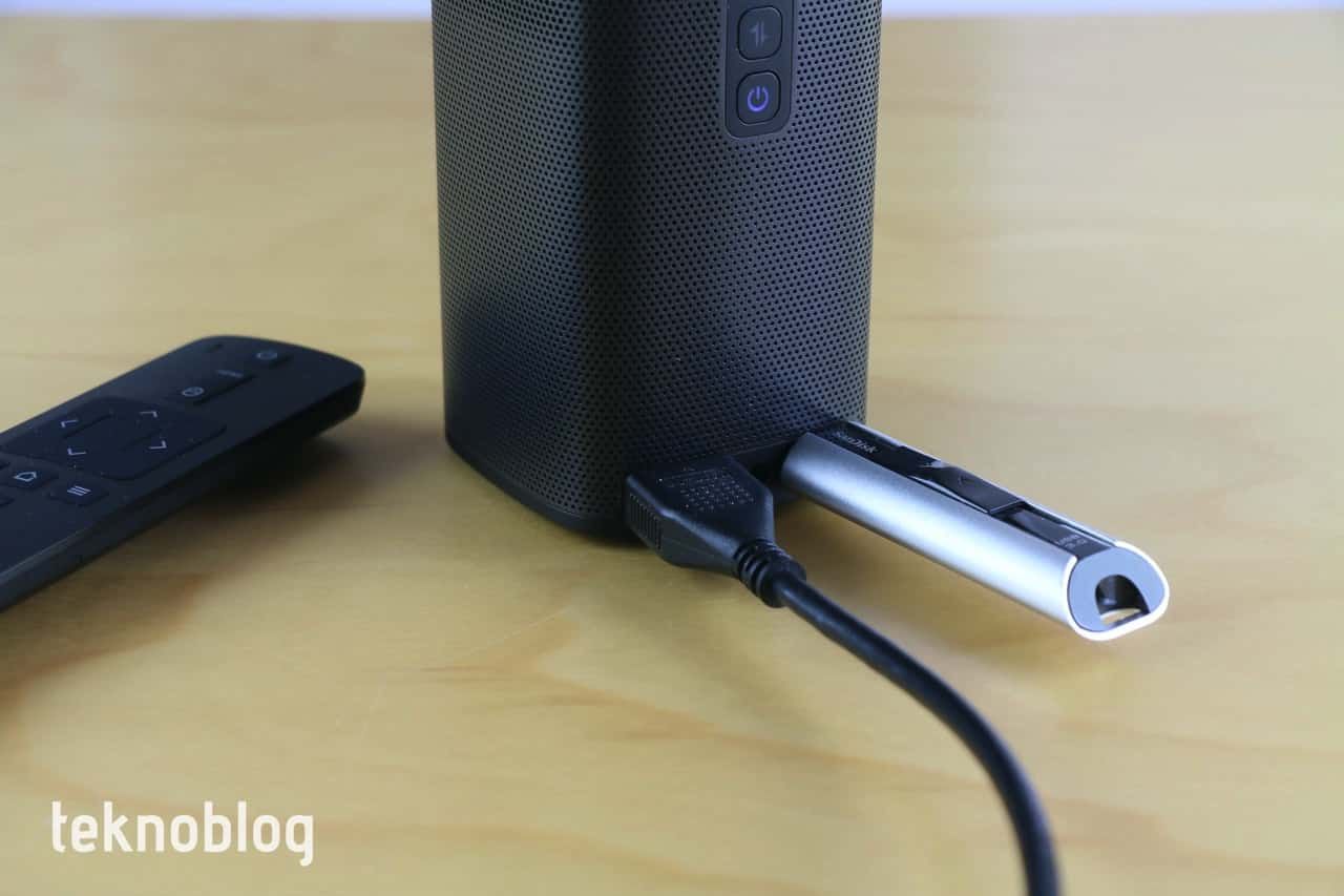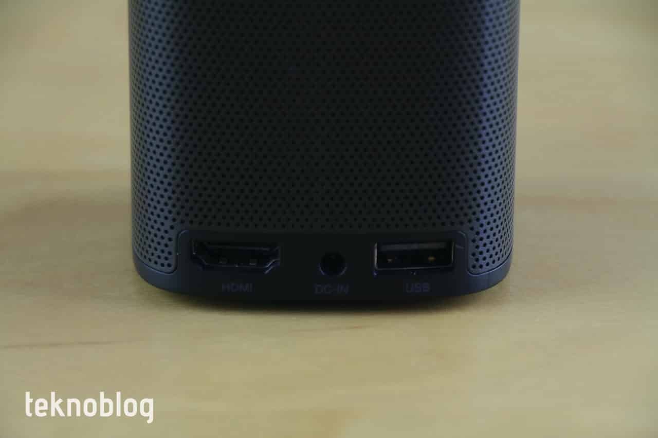 Ön tarafta, üst kısma yerleştirilmiş lens var. Sol tarafta, lensin arkasına gelecek biçimde küçük bir netleme halkası mevcut. Bu sayede yansıtma yüzeyine olan mesafeye göre netlemeyi gerçekleştirebilirsiniz. Arkada güç ve Bluetooth bağlantı düğmelerini görüyoruz. Yine Arkada, en alt bölümde ise güç girişinin yanı sıra birer adet HDMI ve USB Tip-A portu var. Alt tarafında ise tripod ile uyumlu bir yuva bulunuyor.