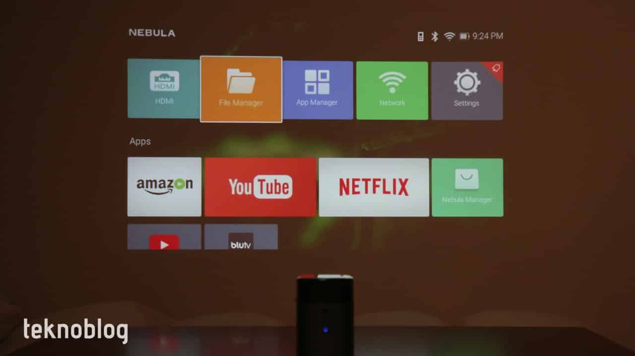 Apollo da, diğer birçok taşınabilir projeksiyon cihazının yolunu izleyerek dahili Android ile yüklü olarak geliyor. Akıcı bir kullanıcı arayüzü var. Ne var ki, içeride çalışan Android 7.1 sürümü Google sertifikalı değil, içinde Google Play Store yerine Aptoide TV uygulama mağazası var. Bu uygulama mağazası içinde Amazon Prime Video gibi tanıdık bazı multimedya uygulamalarını veya internet tarayıcısını görüyoruz. Bazı uygulamalarda uyumluluk sorunları gözlemledik. Ancak kullanıcıların genel olarak YouTube ve Netflix’i kullandığını göz önünde bulundurursak, bu uygulamaları herhangi bir harici kaynağa ihtiyaç duymadan, Wi-Fi bağlantısından yararlanarak oynatmak mümkün oluyor. Üçüncü taraf uygulamaların bazı yerleşik uygulamaları görüyoruz. File Manager uygulaması, arkadaki USB portuna takacağınız bir harici diskteki dosyalarda gezinmenizi, fotoğrafları veya videoları görüntülemenizi sağlıyor. App Manager ise File Manager, Media Play, WebView Browser gibi dahili uygulamalara açılıyor. Network uygulaması ise Wi-Fi bağlantı ayarlarını yapmaya izin veriyor.