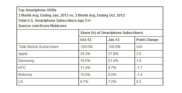 ComScore tarafından yayınlanan son rakamlara göre, Apple ABD akıllı telefon pazarındaki liderliğini güçlenerek sürdürüyor. Şirketin Ekim 2012’de yüzde 34.3 olan akıllı telefon pazarındaki payı 2013’ün ocak ayında yüzde 37.8’e yükseldi. Böylelikle Apple en yakın rakibi Samsung ile arayı biraz daha açmış oldu. Aynı dönemde pazar payı yüzde 19.5’ten yüzde 21.4’e yükselen Samsung ise farkın az da olsa açılmasına engel olamadı.