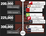 Mobil uygulama blogu 148apps, arama şirketi Chomp ve oyun geliştiricisi Chillingo tarafından hazırlanan infografikler çeşitli bilgiler, sıralamalar ve kronolojilerle zenginleştirilmiş. Apple’ın 500 bin iOS uygulaması barajını aşması App Store’un açılmasından 34 ay sonra gerçekleşti. Geçtiğimiz ocak ayında 10 milyar uygulama indirme rakamının geçildiği App Store’un en yakın takipçisi Android Market’te ise 294 binin üzerinde uygulama yer alırken buradan indirilmiş uygulama sayısı da 3 milyarı geride bıraktı.