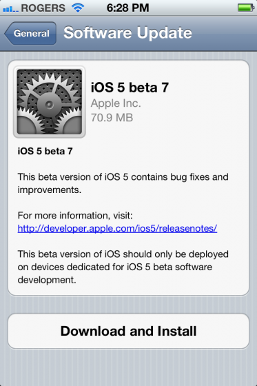 Apple, iOS 5’in yedinci beta sürümünü kablosuz bağlantı üzerinden indirilip kurulabilecek şekilde yayınladı. iPhone, iPad ve iPod touch’a özel bu güncellemeyle birlikte Apple TV beta 7, iTunes 10.5 beta 7, Xcode ve iCloud beta sürümleri de duyuruldu.