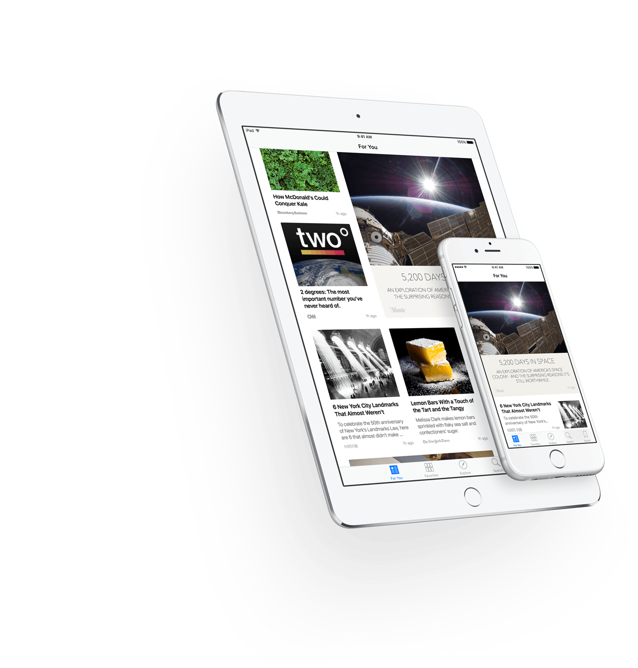 iOS 9 ile birlikte News (Haberler) olarak adlandırılan yeni bir uygulama da geliyor. Adından anlaşılacağı üzere bu uygulama sayesinde çeşitli haber kaynaklarına ulaşmak mümkün olacak. Haberler ve makaleler mobile uyumlu formatta, hızlı yüklenen ve bilgi verici animasyonlar ve ekrana yayılan görüntüler eşliğinde gösteriliyor. Apple bu yeni uygulaması için CNN, Time, Wired, ESPN, Buzzfeed, The Verge gibi birçok haber kuruluşundan destek alıyor. Ayrıca uygulama herhangi bir web bağlantısından çekilen makaleleri de gösteriyor. Ancak Apple en iyi deneyimin uygulama için özel olarak oluşturulmuş içeriklerle sağlanabileceğini belirtiyor. Apple News App Store’da uzun zamandır bulunan Flipboard ve benzeri haber okuma uygulamalarına fazlasıyla benziyor. Apple uygulamasının kullanıldıkça daha akıllı hâle geldiğini ve sizin okuma tercihlerinize uygun içerik ve makaleler önerdiğini de kaydetti. News ilk etapta ABD, İngiltere ve Avustralya’da kullanıma sunulacak.