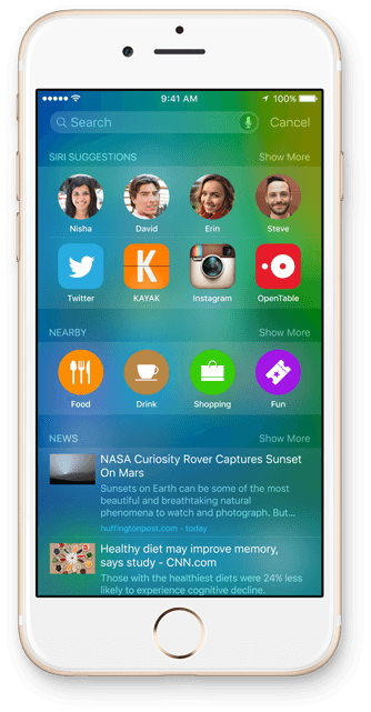 Proactive Siri’nin telefonunuzda hangi uygulamalar olduğunu görmesini ve yaptığınız işe göre yararlı olanları o an tavsiye etmesini sağlıyor. Apple Siri’nin gelen kutunuzdan adres defterinizde olmayan gelen arama kimliklerine kadar bakabildiğini de söylüyor. Bütün bunlar iOS ana ekranında aşağı doğru sürükleme hareketiyle açılan Spotlight içinde yeni bir kullanıcı arayüzünde gösteriliyor.