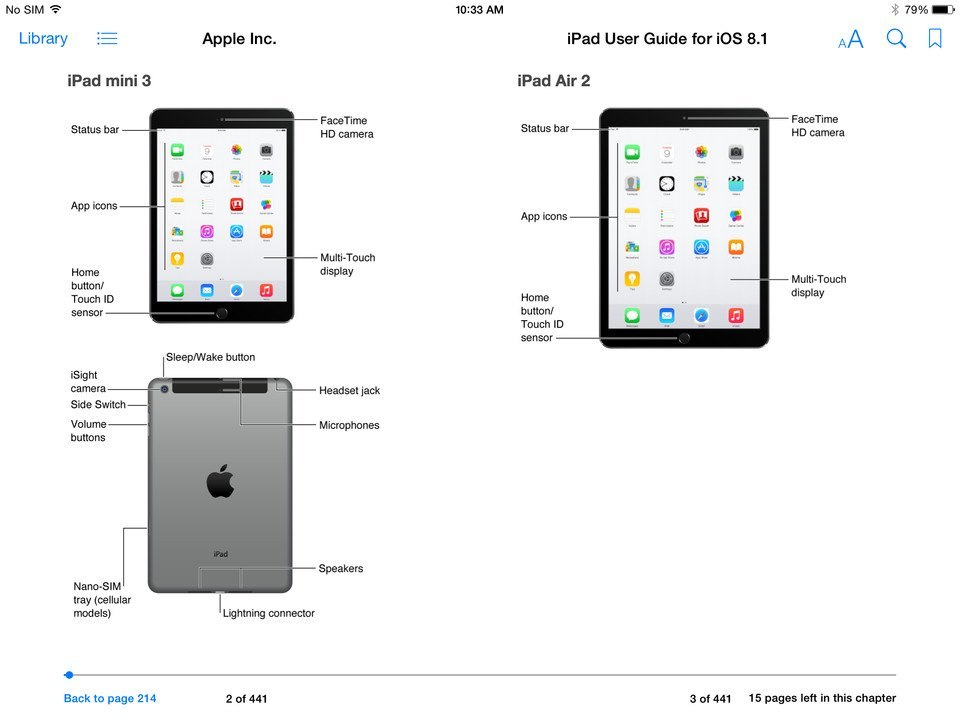 iTunes Store’da yer alan ve iOS 8 için hazırlanmış resmi kullanım kılavuzunun ekran görüntüleri zamanından önce güncellenince yeni iPad’ler de gösterilmiş oldu. Her iki cihaza ait görüntülerde TouchID parmak izi okuyucusu dikkat çekiyor. Touch ID sensörünün eklenmesinin dışında bu yeni iPad’ler selefleriyle aynı görünüyor. iPad ekran görüntülerini ilk olarak 9to5Mac ortaya çıkarırken tam çözünürlükteki görüntü hâlâ Apple’ın sunucularında durmaya devam ediyor.
