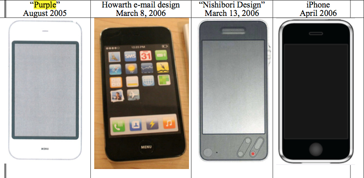 Mahkeme dokümanlarına göre Shin Nishibori’nin Sony tarzı çizimleri de basitçe eğlence amacıyla gerçekleştirilmiş bir yan projeydi ve Apple’ın çoktan tasarladığı konsept baz alınarak geliştirilmişti. Dokümanlara göre 2006 yılında temel iPhone tasarımının gerçekleştirilmesine yol açan ve görünüş açısından iPhone 4’e benzeyen Purple prototipinin Sony’den esinlenme iddialarıyla herhangi bir bağlantısı yok.