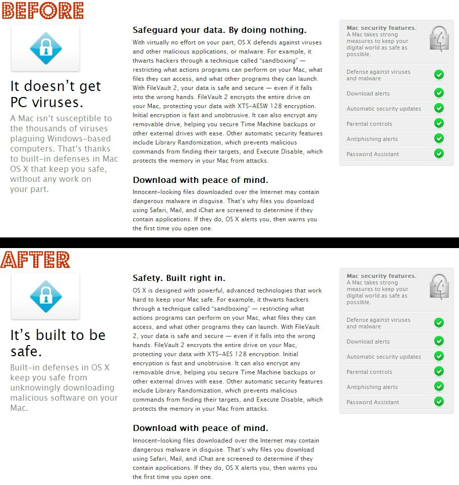 Apple, Mac OS X’in virüs ve zararlı yazılımlara karşı bağışıklık sahibi olduğu iddiasını uzun bir süre boyunca önemli bir pazarlama silahı olarak kullanmaktaydı. Ancak, bu durum artık geride kalmışa benziyor. Şirket, bu ayın ilk günlerinde ”Neden Mac’i seveceksiniz?” sayfasında bazı değişiklikler yaptı ve ”PC virüslerini almaz” ibaresini ”Güvenli olmak için üretilmiştir” ibaresi ile değiştirdi. Şirketin tanıtımda yaptığı değişiklikler bununla da sınırlı değil. ”Verilerinizi hiçbir şey yapmadan koruyun” cümlesi de ”Güvenlik” kelimesi ile değiştirildi.