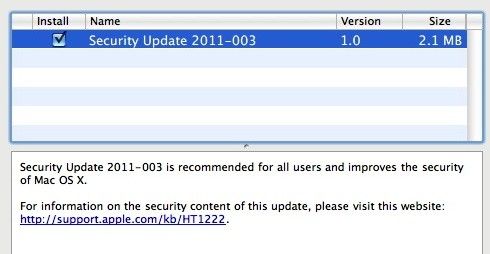 Beklenen güvenlik güncellemesi Mac Security Update 2011-003 adıyla yayınlandı. Bu güncelleme sistemdeki mevcut MacDefender zararlı yazılım yüklemelerini bulup bunları kaldırıyor ve gelecekte bu yazılımın tekrar yüklenmesine engel oluyor. MacDefender için karantina altına alınmış dosya nitelendirmesi yapan bu güncellemenin getirdiği tanımlar MacDefender’ın gelecek sürümlerinde ve OS X 10.6.7 platformlarında da geçerli olacak.