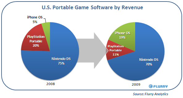 Flurry Analytics’in ABD genelinde yapmış olduğu araştırmanın sonucuna göre iPhone’un oyun yazılımı pastasından aldığı pay hatırı sayılır derecede artmış. Nintendo DS iki sene önce olduğu gibi liderliğini korumaya devam ediyor, üstelik pastadaki paydan çok az bir kayıpla… Ancak PlayStation Portable oyun yarışında yara almış gibi görünüyor. Bu oyun konsolunun 2008 yılında ABD’deki yüzde 20’lik pazar payı geçen sene yüzde 11’e gerilemiş. Bakalım 2010’un rakamları nasıl şekillenecek. Piyasaya girecek olan iPad hangi oyuncunun pastasından pay kapacak?
