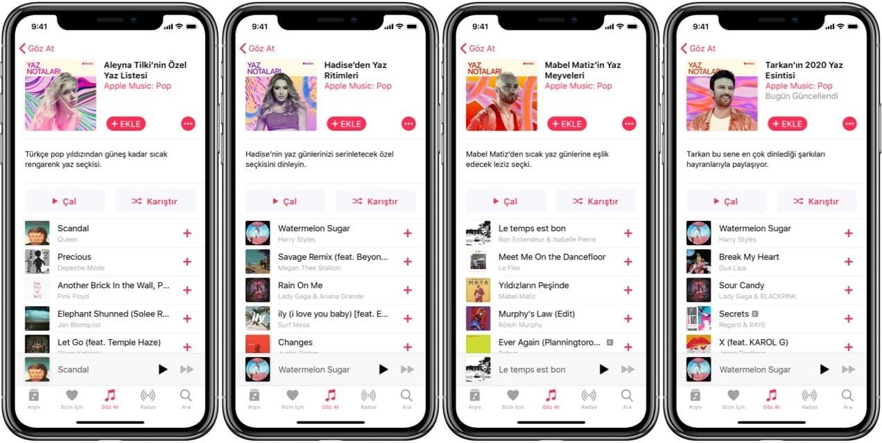 Apple Music bu sene Yaz Notaları sayfasında Türkiye’nin starlarının dinleyiciler için oluşturduğu listeleri dinleyicilere sunuyor. Tarkan’ın 2020 Yaz Esintisi, Hadise’den Yaz Ritmleri, Mabel Matiz’in Yaz Meyveleri ve Aleyna Tilki’nin Özel Yaz Listesi, dünya starlarının listeleriyle beraber Yaz Notalarında yer alıyor.