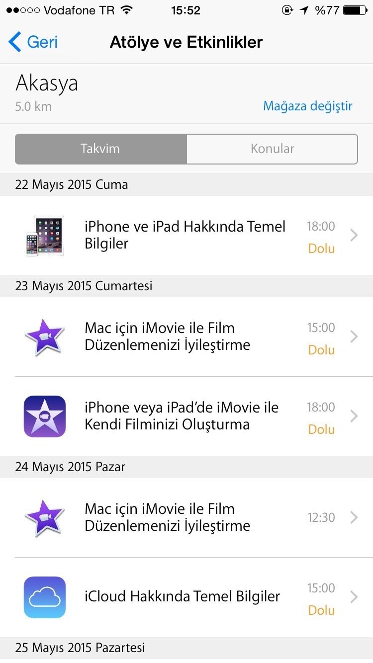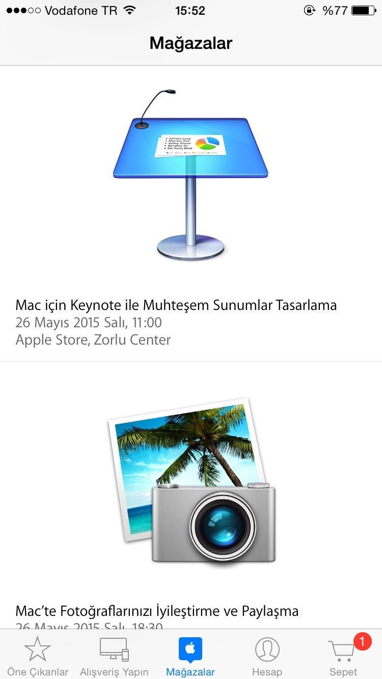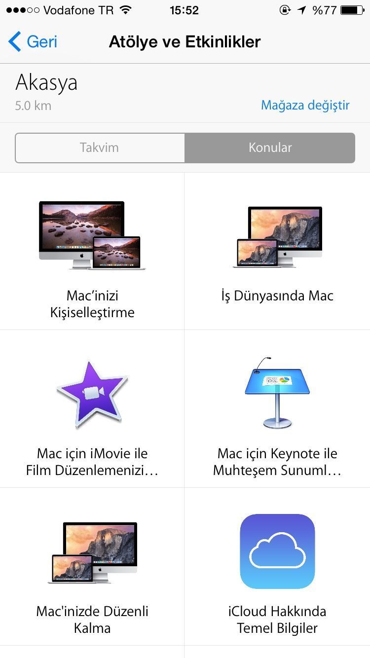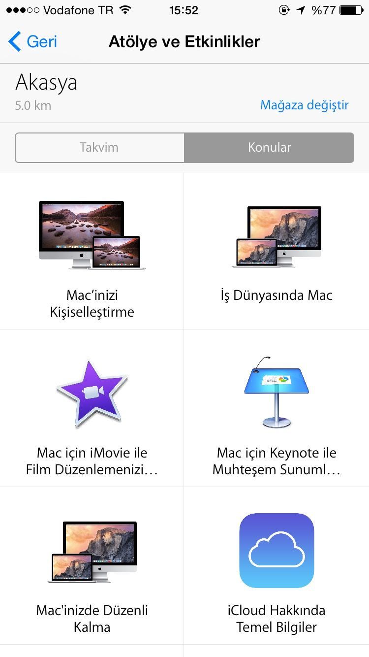 Apple Store uygulamasının mağazalar sekmesindeyse Apple’ın Akasya ve Zorlu Center’daki fiziksel mağazalarına dair bilgilere erişilebiliyor. Bu sekmedeki mağaza sıralaması coğrafi yakınlık kriteri çerçevesinde yapılıyor. Apple mağazalarında verilen Genius Bar, One to One gibi hizmetler için Apple Store uygulaması aracılığıyla randevu alınabiliyor. Mağazalarda düzenlenen atölye ve etkinliklere katılım kaydı oluşturmak ve etkinlik programını görmek için de Apple Store uygulamasına göz atmak yeterli oluyor.