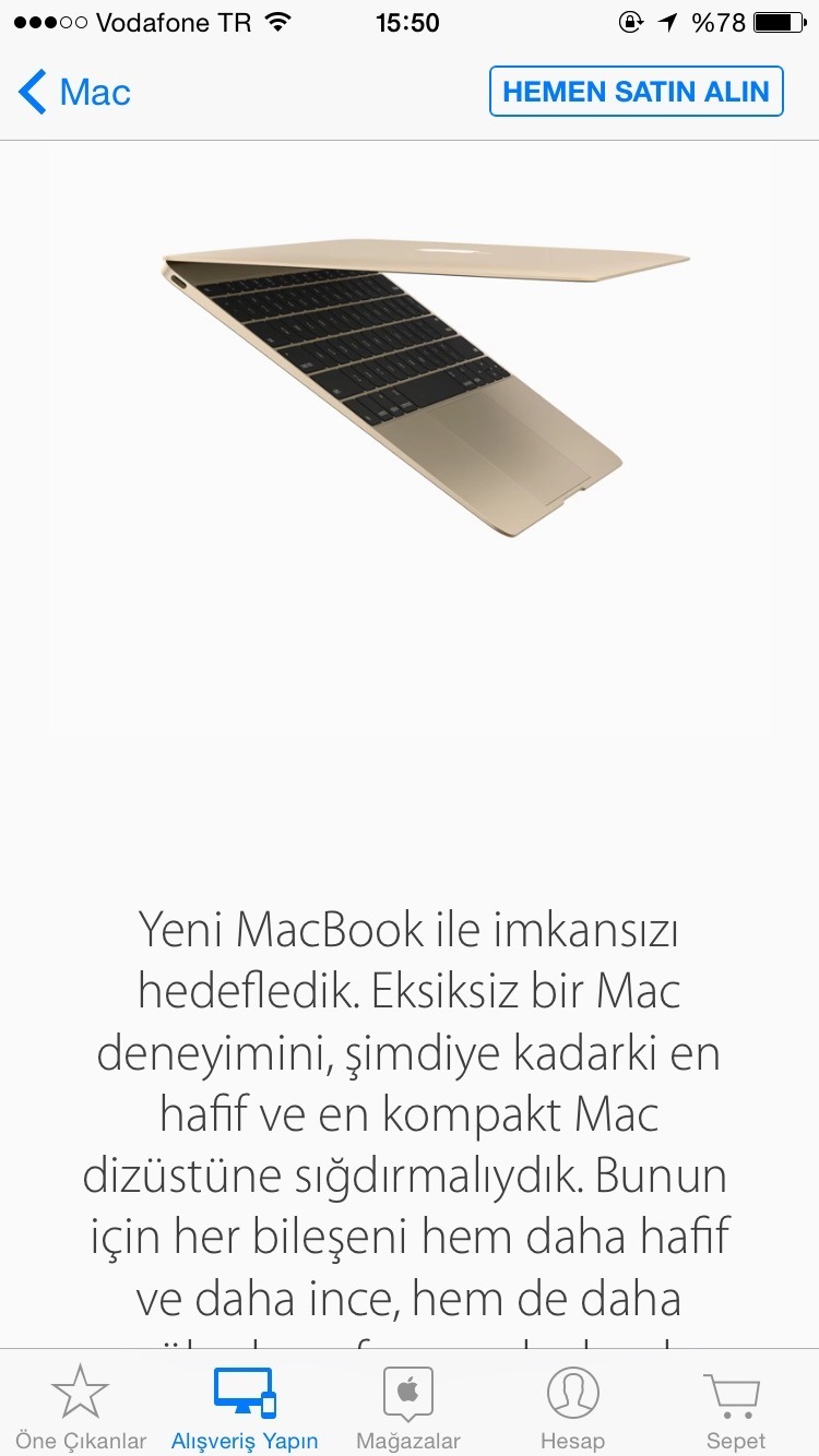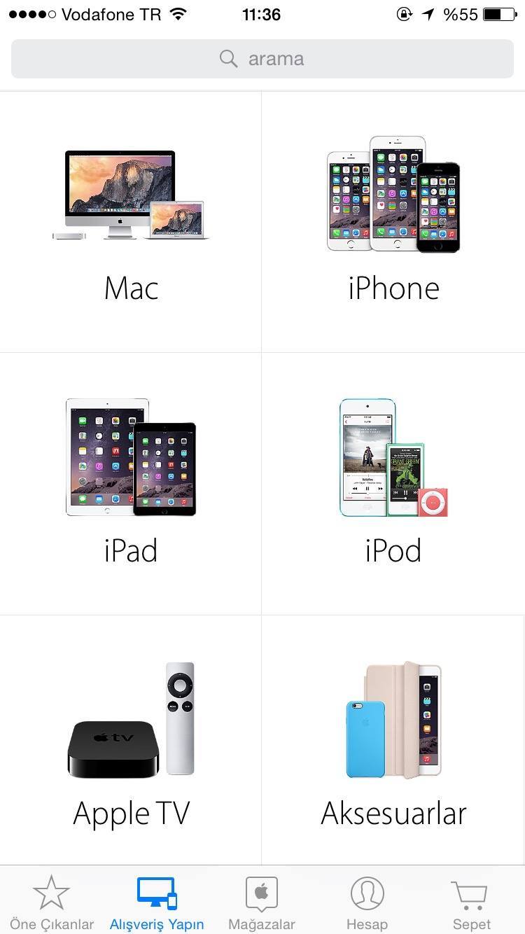 Alışveriş Yapın sekmesindeyse Apple Online Store’da bulunan tüm ürün kategorileri ızgara görünümünde listeleniyor. Mac, iPhone, iPad, iPod modelleri, Apple TV ve aksesuarlara bu sekme üzerinden erişilebiliyor. Kullanıcılar satın almak istedikleri ürünü seçtikten sonra, diledikleri konfigürasyon ayarlarını Apple Store uygulaması üzerinden yapabiliyor. Bunun için ürün sayfasına gittikten sonra sayfanın sağ üst kısmında bulunan “Hemen Satın Alın” ikonuna dokunmak gerekiyor.