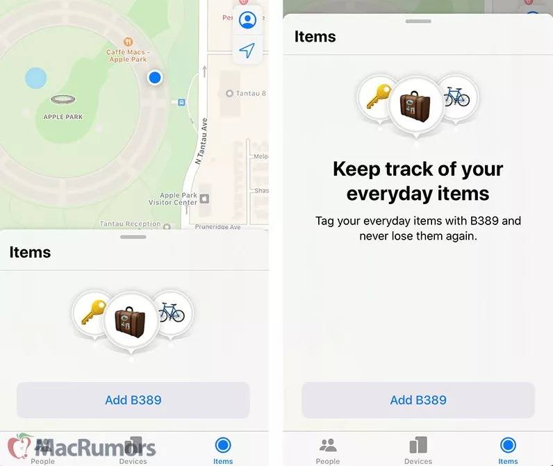 MacRumors sitesinde yayınlanan ekran görüntüleri, iOS 13’teki “Bul” uygulamasında “Ben” sekmesinin yerini “Eşyalar” isimli bir sekmenin aldığını gösteriyor. Bu sekmeye tıklandığında “Her gün kullandığınız eşyaları takip edin” şeklinde bir mesaj görülüyor. Bu mesajın altında ise “Günlük eşyalarınızı B389 ile etiketleyin ve bir daha asla kaybetmeyin” cümlesi yer alıyor.