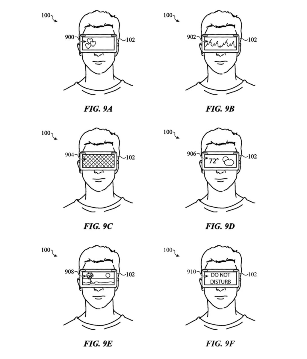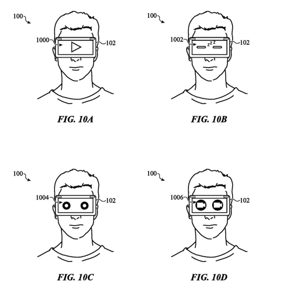 Vision Pro’nun ve “EyeSight” özelliğinin spesifik olarak bahsedilmese de, bu fikirlerin final üründe yer aldığı açıkça görülüyor. Örneğin, Apple, Vision Pro’nun dış ekranının etraftaki insanlara cihazı kullanan kişinin gözlerini veya sanal gerçeklik deneyiminin tam ortasında olduğuna dair renkli desenler gösterebileceğinden bahsediyor. Ancak patentte yer alan görseller, dış ekranın biraz daha marjinal özellikler için kullanılma ihtimallerini de gösteriyor; örneğin hava durumunu gösterme, yüzünüze sanal güneş gözlüğü takma, RAHATSIZ ETMEYİN işareti veya hatta kullanıcının gözlerini Apple’ın diğer head-mounted cihazları ile değiştirme gibi.