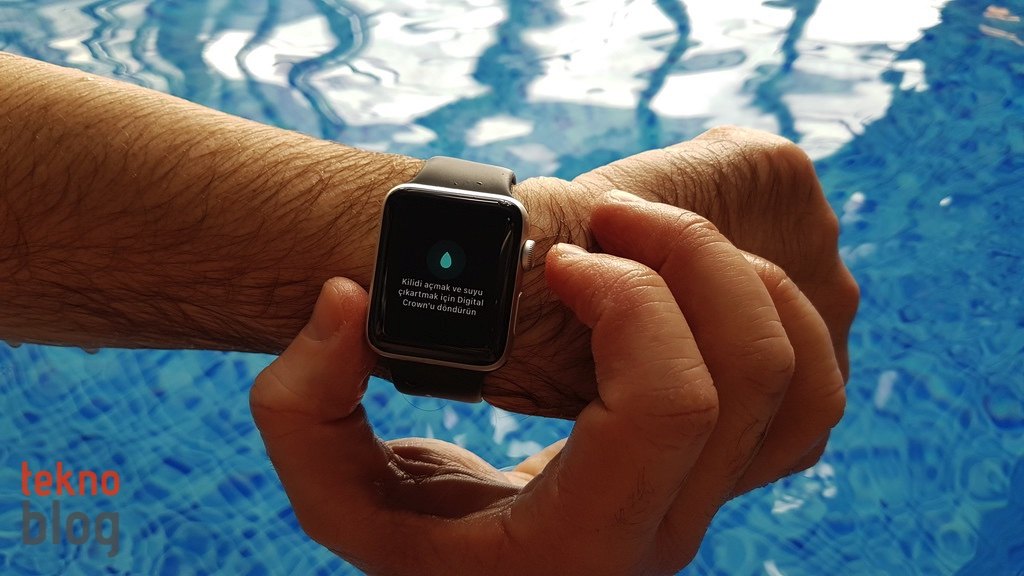 Havuzda veya denizde yüzerken Antrenman uygulamasından takip işlevini açtığınızda, sıvı kilidi devreye giriyor ve yukarıda saydığımız işlevler etkin hâle geliyor. Antrenman bittiğinde Digital Crown halkayı çevirerek saatin içine girmiş olan suyu boşaltabilirsiniz. Watch, suyu boşaltırken farklı frekanslarda yayılan sesi kullanıyor. Sesin oluşturduğu titreşim sayesinde hoparlörden dolmuş olan su dışarı atılıyor.
