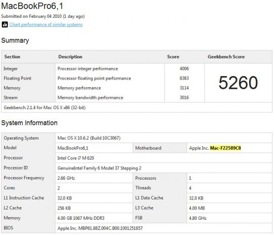 Henüz duyurusu yapılmamış ve Intel Core i7 işlemciyle çalışan bir MacBook Pro’ya ait olan benchmark sonucunun bir internet sitesinde yer alması, Apple’ın MacBook serisinde yenileme yapacağına dair beklentilerin fitilini ateşledi. Geekbench sitesindeki kayıtlar 4 Şubat 2010 tarihinde girilmiş. MacBookPro6,1 olarak listelenen bu model 2.66 GHz’lik Core i7-620M işlemci ve 4 GB’lık DDR3 bellek içeriyor.