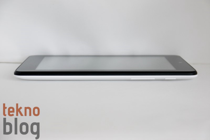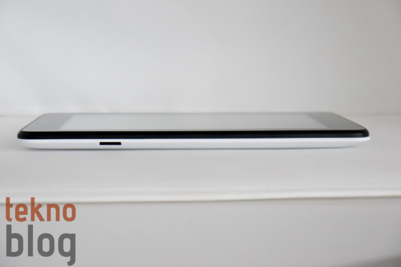 ASUS Memo Pad HD 7’ye yandan baktığınızda ön ve arkadan oluşan iki parçanın kenarlarda birleştirildiğini göreceksiniz. Öndeki siyah renkli panelle arkadaki beyaz renkli panel hoş bir uyum oluşturuyor. Giriş, çıkış ve butonlar genellikle beyaz bölgede kalıyor. Aslında bu durum özellikle butonların daha rahat kullanılmasını sağlıyor. Sağ kenarda yukarıdan aşağı doğru güç ve ses butonlarını görüyoruz. Sol kenarda da bir microSD kart yuvası dikkat çekiyor. Üstte de 3.5 mm. kulaklık jakı, mikrofon ve microUSB portu birbirine çok yakın şekilde yerleştirilmiş.