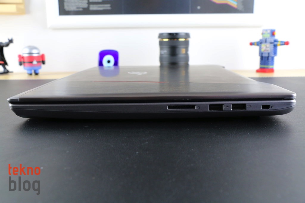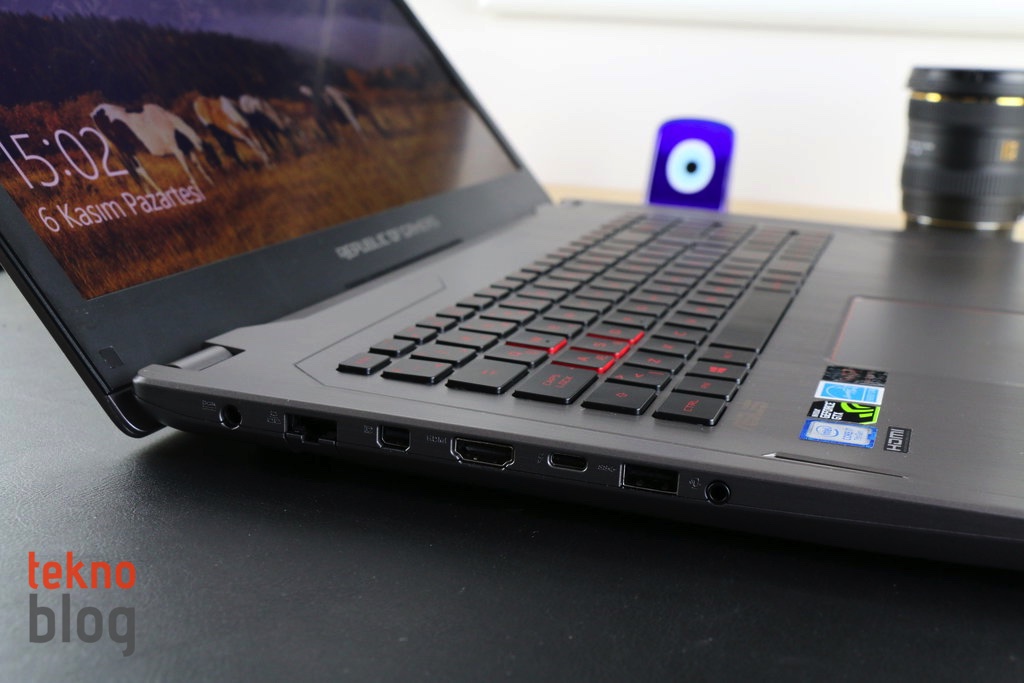 Strix GL702VM’nin kenarları, giriş sayısı bakımından oldukça zengin. Dizüstü bilgisayarda üç adet USB 3.0, bir Thunderbolt 3, bir Mini Displayport, bir HDMI ve bir de Ethernet girişi yer alıyor.