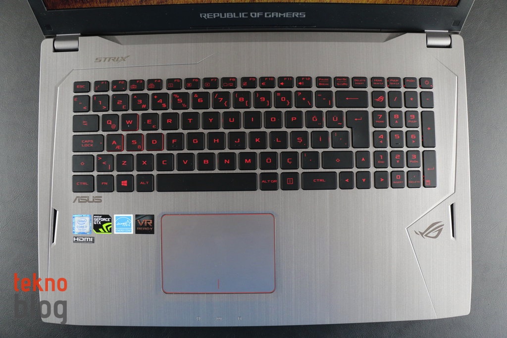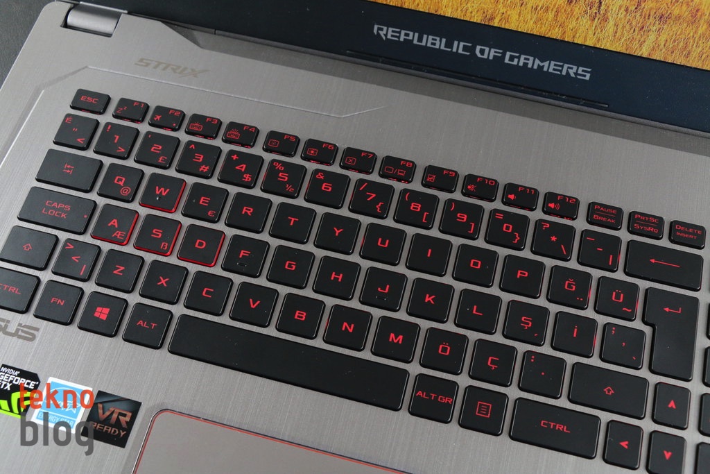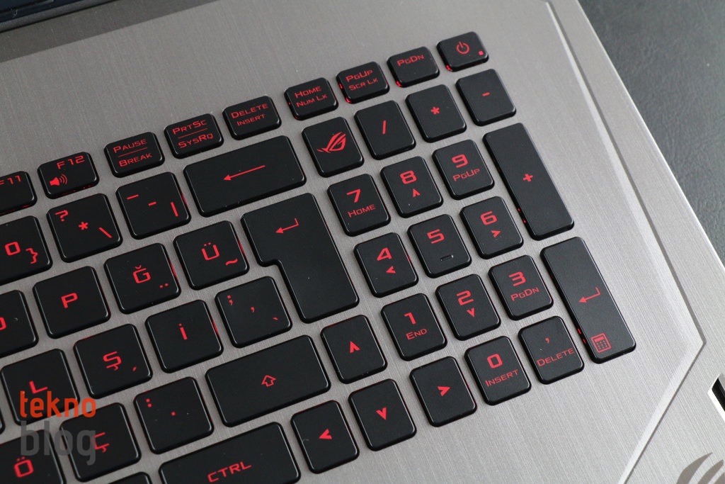 Strix GL702VM’nin klavyesi kırmızı ışıkla aydınlatılıyor. Kullanıcılar diledikleri takdirde bu ışığın parlaklık seviyesini ayarlayabiliyor. Numara tuşlarını eksiksiz olarak barındıran klavyede standart boyutlarda bir geri dönüş tuşu da bulunuyor.