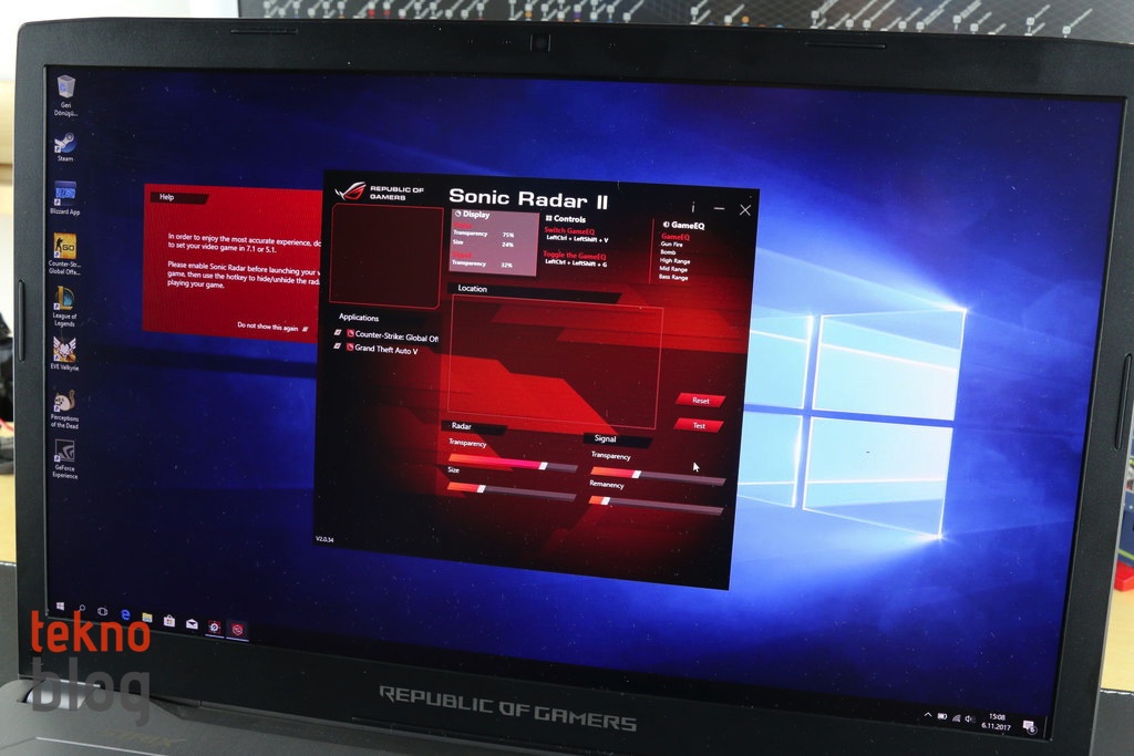 Strix GL702VM’de ses deneyiminin yönetimi, yine Gaming Center üzerinden rahatlıkla erişilebilen Sonic Studio II uygulamasıyla yapılıyor. Farklı sekmeleri bulunan uygulamada kullanıcılar ön ayarlı ses profilleri arasında geçiş yapabiliyor.