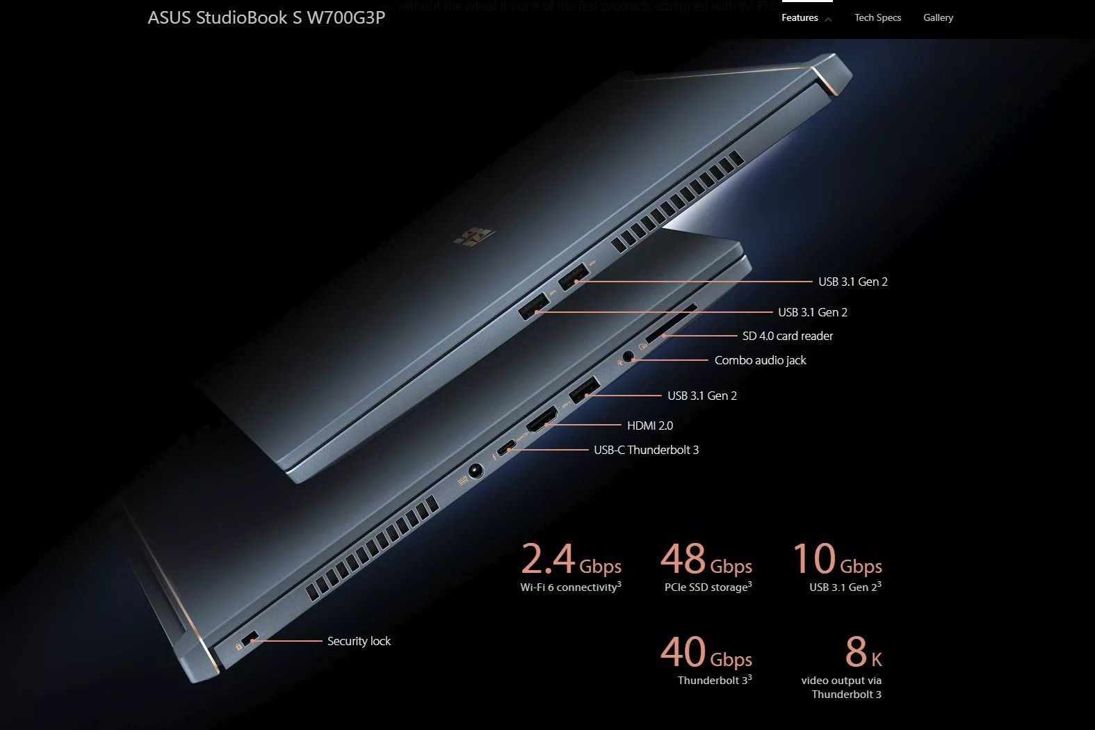 Asus StudioBook S, 64 GB’ye kadar bellek ve 4 TB’ye kadar PCIe SSD depolama seçenekleriyle konfigüre edilebiliyor. Altı çekirdekli Intel Xeon E-2176M işlemci, Nvidia Quadro P3200 grafik işlemci birimi de diğer özellikler arasında yer alıyor. Wi-Fi 6 bağlantı desteğine sahip ürün, USB adaptörü üzerinden Ethernet bağlantısı da sunuyor. Ancak diğer port seçenekleri bakımından epey zengin görünüyor.