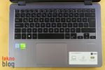 Klavye ve izleme dörtgeninin olduğu bölüme baktığımızda, avuç içlerinin destek aldığı yüzeyler yeteri kadar geniş tutulmuş. Üstelik bu bölümlerin yüzey sürtünmesi kapağın yüzeyine göre biraz daha fazla. Bu da yazı yazarken avuç içlerinin kaymasının önüne geçiyor. İzleme dörtgeni biraz daha sol tarafa kaymış şekilde yerleştirilmiş, tam olarak ortalanmamış.