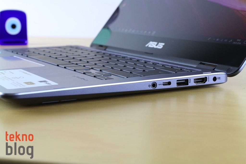 Bağlantı seçenekleri bakımından da Asus, VivoBook Flip 14’ten hiçbir esirgemede bulunmamış. Sağ kenarda güç girişi, HDMI çıkışı, USB-A portu, USB-C portu ve 3.5 mm. kulaklık jakı bulunuyor. Solda ise iki adet USB-A portu daha görüyoruz. Bunların yanında SD kart yuvası bulunurken, daha da ilerlediğimizde gösterge lambaları, ses ve güç düğmelerini görüyoruz. Güç düğmesi, bir dizüstü bilgisayarda alıştığımız yerin dışında bir yere konumlandırılmış. Ancak Flip 14’ün bir tablet olarak da kullanıldığını göz önünde bulundurursak, bu yer seçiminin çok da yanlış olmadığını söyleyebiliriz.