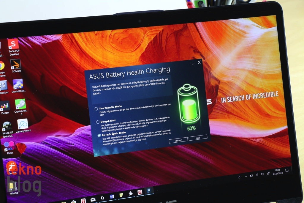 Bu arada Asus’un Battery Health Charging adı verilen teknoloji sayesinde pil koruması sağlanıyor. Bildiğiniz gibi, bir pili boşaltıp şarj ettikçe performansı yavaş yavaş düşmeye başlar. İşte Asus’un teknolojisi pili koruyarak performans düşüşünü yavaşlatıyor. Ayrıca ürünün kutusundan çıkan şarj adaptörü de hızlı şarj özelliğine sahip. 50 dakikada yüzde 60, yaklaşık 1 saat 45 dakikada da tam doluluğa ulaşmak mümkün oluyor.