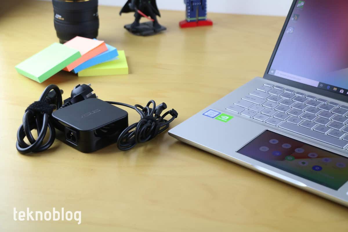 VivoBook S14’ün kutusundan gelen şarj adaptörü belki çok büyük sayılmaz, ancak iki parçalı kabloyla geliyor. Bu nedenle kablo miktarı fazla, çantada daha fazla alan kaplayacaktır. Asus’un kendi şarj girişiyle uyumlu olan bu adaptör, bir saate yakın bir sürede yüzde 60 seviyesine kadar şarj edebiliyor.