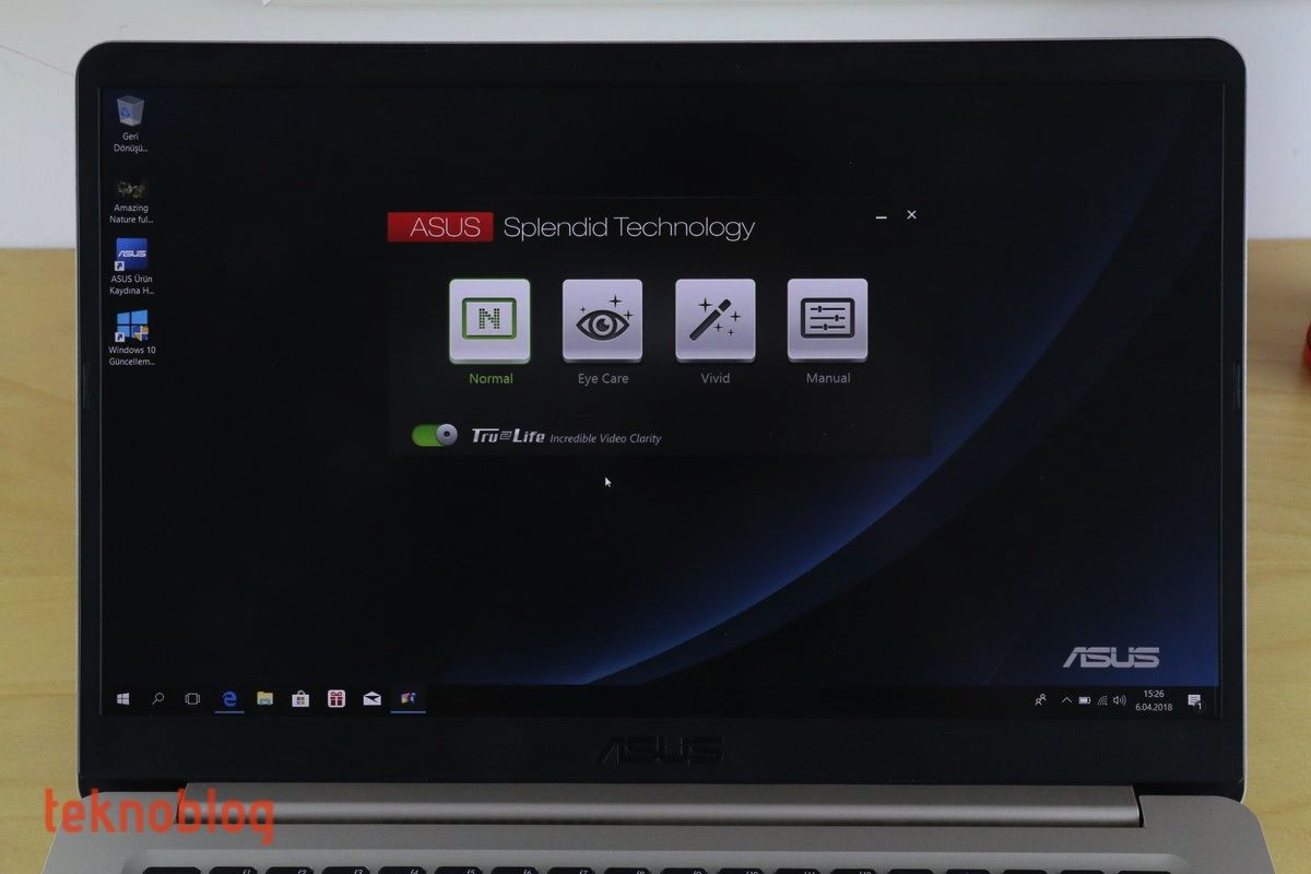 Asus ekrana alışılageldik dokunuşlarını yapmayı da ihmal etmemiş. Şirketin “Splendid Utility” adını taşıyan ekranı özelleştirme aracı, VivoBook S510U’da mevcut. Bu sayede kullanıcılar ekrandaki renklerin canlılık seviyesini biraz daha yukarıya çekebiliyor.