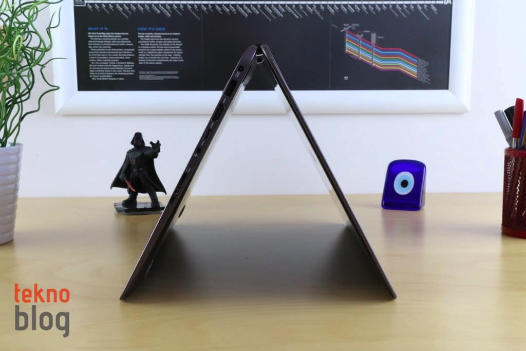 Asus’un incelik ve farklı formlarda kullanım uğruna fedakarlıkta bulunduğu yerlerden birisi hoparlörün konumu oluyor. Dizüstü bilgisayar formunda kullanılırken, hoparlörler altta kalıyor. Bu da bilgisayarda yazı yazarken bir şeyler dinlemek isteyenlerin ses deneyimini olumsuz yönde etkiliyor. ZenBook Flip UX360UA’yı çadır formunda veya tablet modunda kullanıp video izlerken ise böyle bir sorun yaşanmıyor.