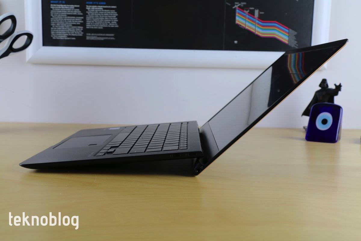 Asus, alışılmışın dışında bir menteşe tasarımını tercih etmiş. Aslında daha önce de benzer tasarımları başka üreticilerin denediğini görmüştük. ZenBook S’in kapağı ve tabanını buluşturan menteşe, kapağın tam kenarına değil, biraz daha içe doğru yerleştirilmiş. Durum bu olunca, kapağı kaldırdığınızda taban ünitesiyle yüzey arasında 5.5 derecelik bir açı oluşuyor. Menteşe ise en fazla 145 derece açılabiliyor. Bu da fazlasıyla yeterli görünüyor.